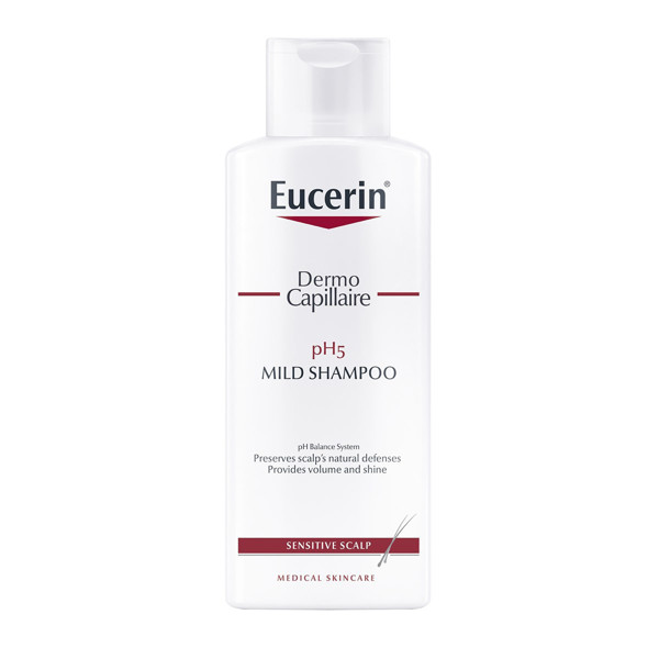 Eucerin® DermoCapillaire pH5 šampūns ir īpaši izstrādāts cilvēkiem ar jutīgu galvas ādu, tas maigi attīra un kopj matus, vienlaikus saglabājot galvas ādas dabiskos aizsargmehānismus.L ai galvas āda būtu veselīga, ir svarīgi uzturēt optimālu pH līdzsvaru. Galvas āda var kļūt jutīga dažādu ārējo vai iekšējo faktoru dēļ. Šampūna sastāvā ir optimāls pH un tas palīdz atjaunot galvas ādas dabiskos aizsargmehānismus, tādējādi samazinot jutīgumu.