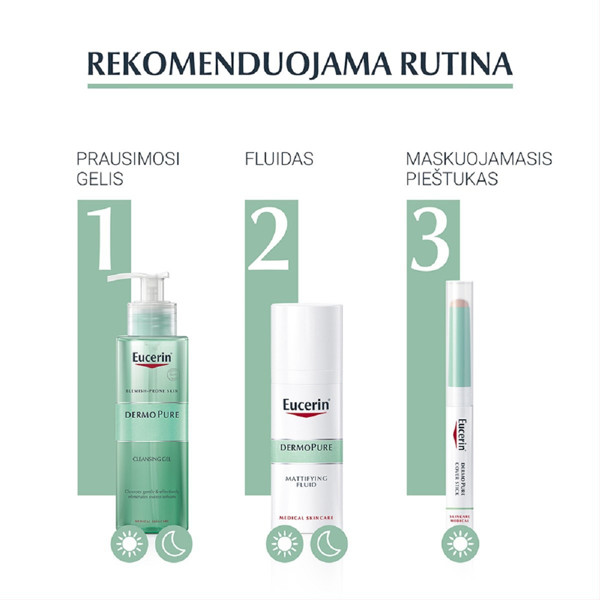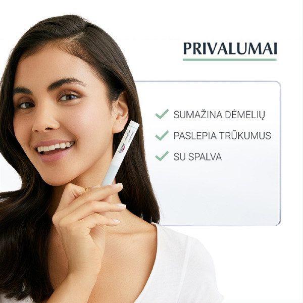 Eucerin® DermoPure maskējošais zīmulis, kas satur salicilskābi, samazina ādas nepilnības, bet krāsu pigmenti maskē nepilnības. Nesatur poras aizsprostojošas vielas un smaržvielas. Klīniskajos un dermatoloģiskajos pētījumos ir apstiprināta tā efektivitāte un piemērotība uz akni tendētai ādai.Uzklājiet plānu kārtiņu 1-3 reizes dienā uz problemātiskajām zonām.