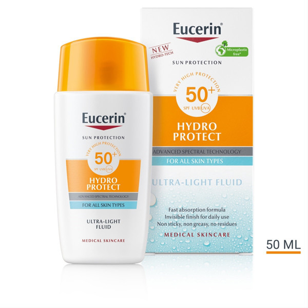 Eucerin Sun Hydro Protect Ultra Light sejas fluidam ar SPF 50+ ir maigs aromāts, īpaši viegla, nemazgājama tekstūra, un tas neatstāj taukainu sajūtu uz ādas. Tā piemērotība visiem ādas tipiem, tostarp jutīgai ādai, ir apstiprināta klīniskos un dermatoloģiskos pētījumos.