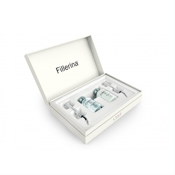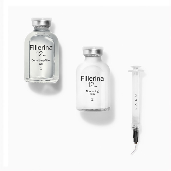 "Fillerina 12HA Dermatological Filler" ar 12 dažādām hialuronskābes molekulām, kolagēnu un peptīdiem dziļai mitrināšanai, atjaunotam izskatam un grumbu aizpildīšanai. Pateicoties transdermālajai tehnoloģijai, hialuronskābe un funkcionālās molekulas iekļūst dažādos ādas slāņos. Komplektā ietilpst aizpildīšanas gēls (1 pudelīte) ar augstu 12 hialuronskābju saturu un barojoša emulsija (2 pudelītes), ko lieto kopā ar gēluPildvielas iedarbība: