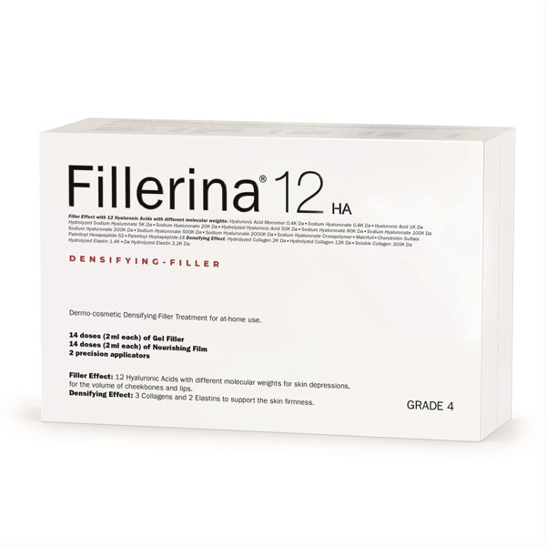Fillerina 12HA dermatoloģiskā pildviela ar 12 dažādām hialuronskābes molekulām, kolagēnu un peptīdiem, kas dziļi mitrina, atjauno un izlīdzina grumbas. Pateicoties transdermālajai tehnoloģijai, hialuronskābe un funkcionālās molekulas iekļūst dažādos ādas slāņos. Komplektā ietilpst aizpildīšanas gēls (1 pudelīte) ar augstu 12 hialuronskābju saturu un barojoša emulsija (2 pudelītes), ko lieto kopā ar gelu. Pildvielas iedarbība: