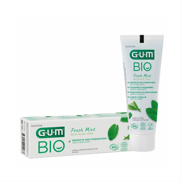 G.U.M.® (7020) Bio-organiskā zobu pasta ar fluorīdu. COSMOS ORGANIC sertificēta Ecocert Greenlife saskaņā ar COSMOS standartu. 22 % no visām sastāvdaļām ir no bioloģiskās lauksaimniecības.