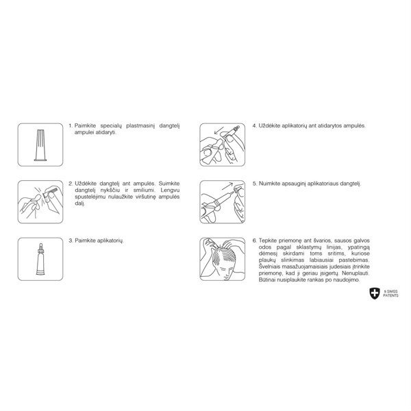 LIETOŠANA: "LABO HAIR LOSS 5 PATENTS" satur 3,5 ml vienā ampulā un jālieto katru otro dienu. Uzklājiet uz sausas galvas ādas vakarā. Neskalojiet.