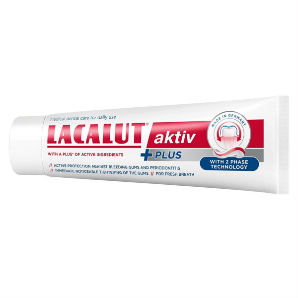 "LACALUT aktiv PLUS" satur pārbaudīto "LACALUT aktiv" formulu ar lielāku aktīvo sastāvdaļu koncentrāciju*. Fluorīds efektīvi novērš zobu bojāšanos. Zobu pastas sarkanais slānis cīnās pret sliktu elpu un nodrošina svaigu elpu. Pastas baltais slānis nostiprina un stiprina smaganas, efekts ir manāms jau pirmajā lietošanas dienā**. Hidroksiapatīts remineralizē un sacietina zobu emalju. Lietošana: tīriet zobus no rīta un vakarā ar zirņa lieluma daudzumu zobu pastas.