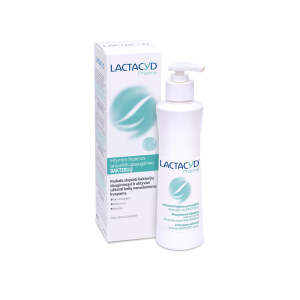"Lactacyd Pharma" intīmās higiēnas tīrīšanas līdzeklis ar antibakteriālām īpašībām pastiprina intīmās zonas dabisko aizsardzību. Tas satur dabīgas antibakteriālas vielas, kas palīdz kavēt baktēriju augšanu un aktīvi novērš nepatīkamu smaku rašanos. Var lietot menstruāciju, grūtniecības un pēcdzemdību laikā. Piemērots arī lietošanai pēc sporta.