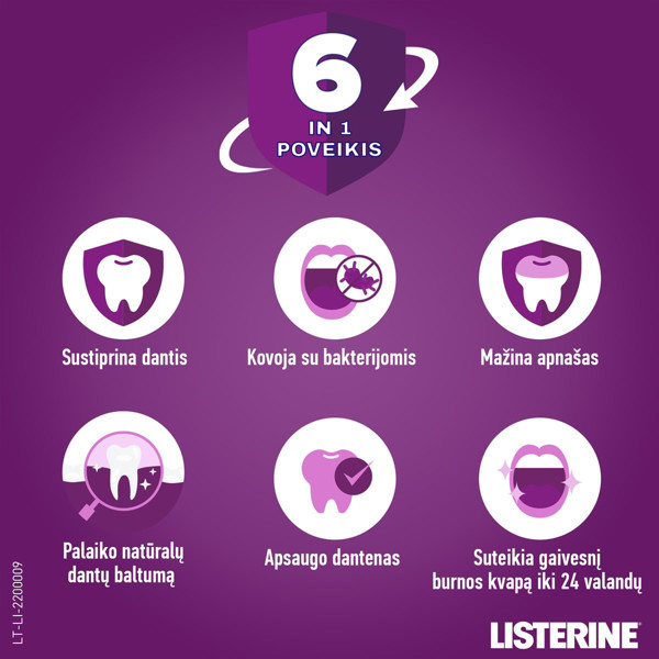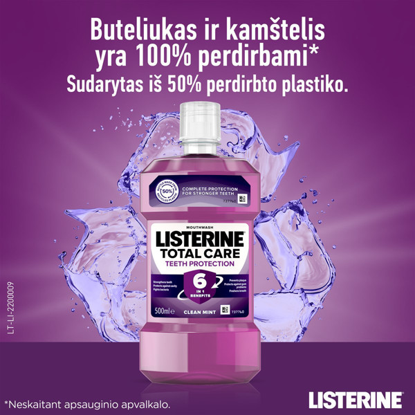 LIETOJOT DIVAS REIZES DIENĀ, LISTERINE® TOTAL CARE UZLABO MUTES DOBUMA HIGIĒNU - AR ĒTERISKAJĀM EĻĻĀM UN FLUORĪDA UN CINKA FORMULU. 6 VIENĀ - VISAPTVEROŠA AIZSARDZĪBA STIPRIEM ZOBIEM: ■ Stiprina zobus ar fluorīdu ■ Novērš kariesa veidošanos ■ Efektīvi cīnās ar baktērijām pat tajās vietās, kuras zobu birste nesasniedz: starp zobiem, uz smaganām un uz mēles ■ Aizsargā un samazina aplikumu, kas ir viens no galvenajiem smaganu kairinājuma cēloņiem ■ Stiprina aizsardzību pret smaganu problēmām ■ Nodrošina svaigu elpu. LISTERINE® antibakteriālās īpašības ir pierādītas klīniskajos pētījumos. Tas arī uztur mutes dobuma floras līdzsvaru. PUDELE UN AIZBĀZNI VAR 100% PĀRSTRĀDĀT*. *izņemot aizsargvāciņu.