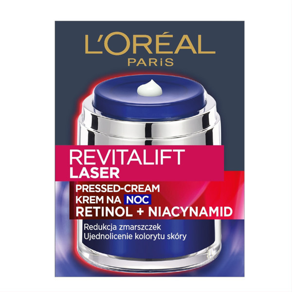 - Par produktuRetinola un niacinamīda spēks maigā formulā un higiēniskā, hermētiskā iepakojumā? L'Oréal Paris Revitalift Laser nakts krēms ar retinolu un niacinamīdu! Formula ir bagātināta ar retinolu, kas stimulē šūnu atjaunošanos dziļos epidermas slāņos: tas padara ādu kuplāku, lai palēninātu novecošanās pazīmes, piemēram, dziļas grumbas un nevienmērīgu ādas tekstūru. Krēma sastāvā ir arī niacinamīds - antioksidants ar balinošu iedarbību, kas palīdz izlīdzināt ādas toni. Krēma formula ir papildināta ar barojošām sastāvdaļām, piemēram, hialuronskābi un barojošu eļļu, kas palīdz novērst kairinājumu un baro ādu. Inovatīvais iepakojums ir izgatavots, izmantojot bezgaisa tehnoloģiju, kas novērš gaisa iekļūšanu produktā, nodrošinot higiēnisku aktīvo sastāvdaļu dozēšanu un svaigumu.