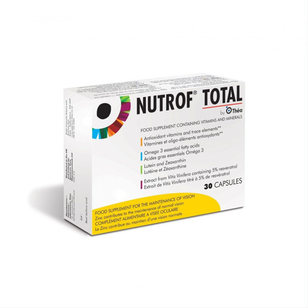 NUTROF® TOTAL satur vitamīnus un minerālvielas*, luteīnu, zeaksantīnu, Omega 3 neaizstājamās taukskābes, īstā vīnkoka augļa mizas ekstraktu (satur 5% resveratrola) un D3 vitamīnu.