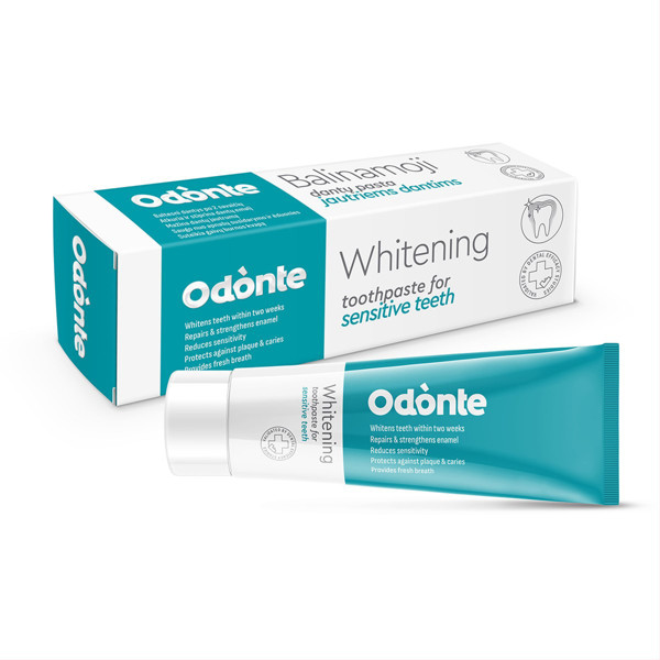 ODONTE balinošā zobu pasta jutīgiem zobiem atjauno un stiprina jutīgus zobus un smaganas.