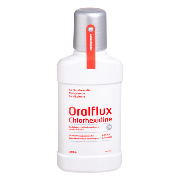ORALFLUX Hlorheksidīns satur 0,12 % hlorheksidīna un 0,2 % nātrija fluorīda. Maiga piparmētru garša, svaiga smarža, bez alkohola un parabēniem, bezkrāsains, ārstniecisks mutes skalošanas līdzeklis.