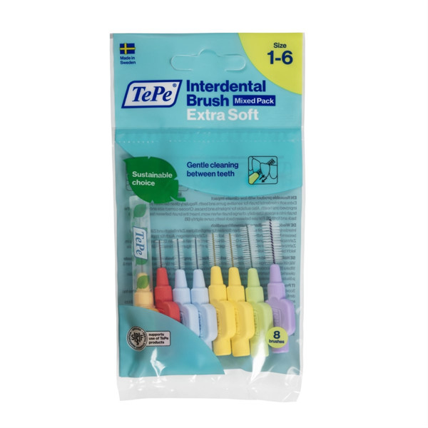 Ieteicams lietot: pēc mutes dobuma operācijām, jutīgiem zobiem un smaganām, iekaisumiem, sausai mutei. Lietojiet pareizā izmēra birstīti ar sariņiem, kas aizpilda starpzobu dobumus, nekad neiespiežiet sariņus spraugās. Pārmērīgs spēks un pastāvīga saliekšana var izraisīt stieples plaisāšanu, kas var radīt traumas. Sīkāku informāciju jautājiet savam zobārstam. Birstītes var izmantot priekšējo zobu, molāru, stomas ierīču, piemēram, kroņu, tiltu un breketu tīrīšanai. Uzglabāt bērniem nepieejamā vietā.Ražotājs: Ražotājs: TePe Munhygienprodukter AB, Zviedrija.