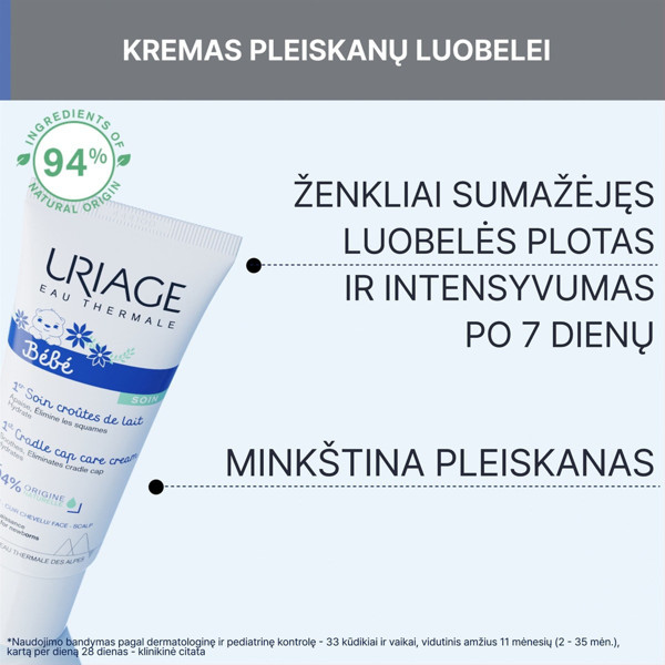 Krēms ar vieglu, nenomazgājamu tekstūru satur Uriage termālo ūdeni, maigas attīrošās vielas un patentētu kairinājumu mazinošu kompleksu, kas saudzīgi noņem galvas ādas blaugznas un palīdz uzturēt normālu galvas ādas stāvokli. Piemērots jaundzimušajiem. 94 % dabiskas izcelsmes sastāvdaļu.