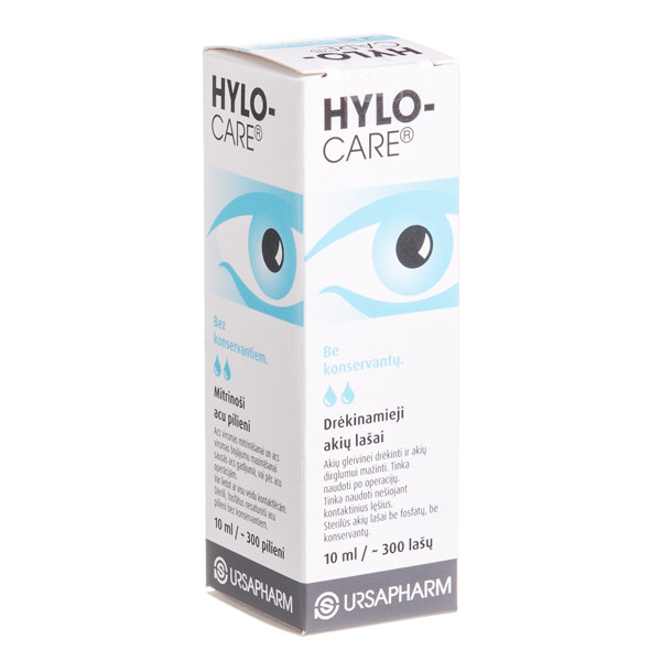 HYLO-CARE® satur hialuronskābes sāli, kas arī ir ne tikai acs, bet arī visa organisma neatņemama sastāvdaļa. Hialuronskābei piemīt īpašība veidot uz acs virsmas vienmērīgu un noturīgu mitrinošu plēvīti, kas saglabājas ilgu laiku. Pateicoties šādai plēvei, mitrinošais efekts ir ilgstošs, negatīvi neietekmējot redzi.