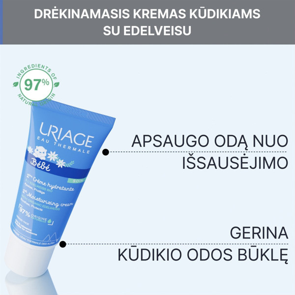 Vieglas konsistences krēms (emulsija) intensīvi mitrina mazuļa ādu un pasargā to no izžūšanas.Krēma dabīgo sastāvdaļu komplekss (termālais ūdens + organiskais edelveisa ekstrakts) un augu skvalēns veido aizsargājošu ādas plēvi un nodrošina ilgstošu mitrināšanu un barošanu. Patīkams aromāts, 97 % dabīgs
